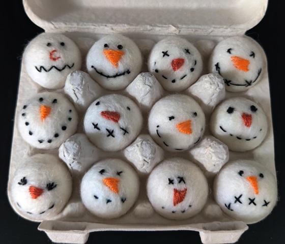 While I have been waiting for my order to arrive, I have been cleaning up my workroom, getting ready for all the new goodies to play with and also doing a bit of stitching. Last night I finished a project started a couple of years ago. A dozen snowman heads. See if you can guess my favorite. Which one is yours?